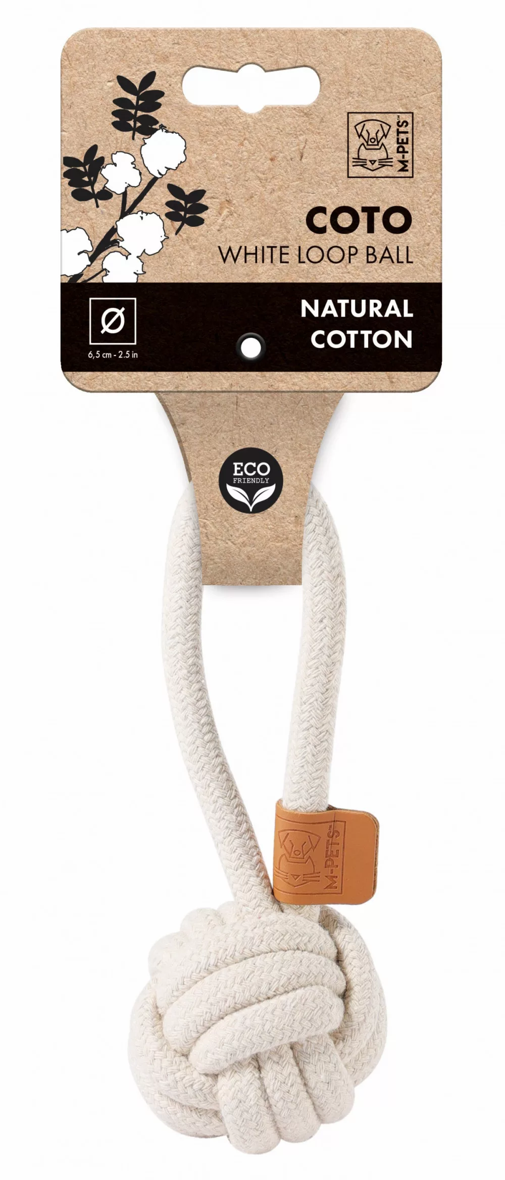 M-PETS kötéljáték füles labda 6,5cm fehér – természetes rágóélmény és vidám közös játék