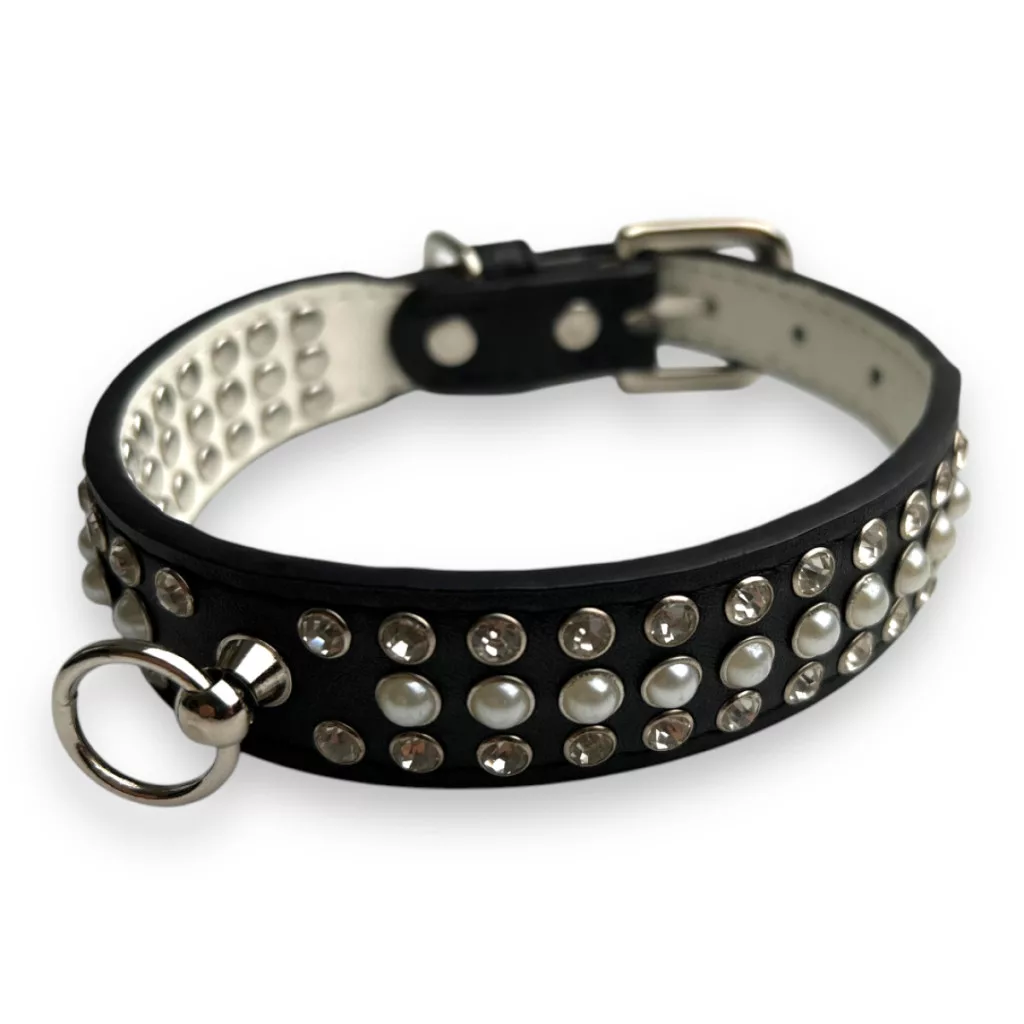 A három sorban futó csillogó kövek és gyöngyök elegáns megjelenést kölcsönöznek, így kutyád minden alkalommal ragyogni fog.