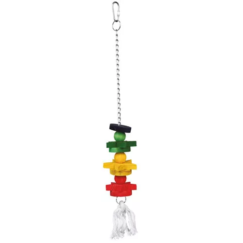 Ez a 30 cm-es függő játék ötvözi a természetes fa érintését a mozgás örömével. A láncra fűzött csillagok nemcsak esztétikusak, hanem kiváló rágófelületet is biztosítanak, ami elengedhetetlen a csőr egészségének megőrzéséhez. A függő elhelyezés miatt a játék minden érintésre elmozdul, így a madaradnak egyensúlyoznia és ügyeskednie kell, ha el akarja érni a kiszemelt elemeket, ez pedig fejleszti a koordinációját.