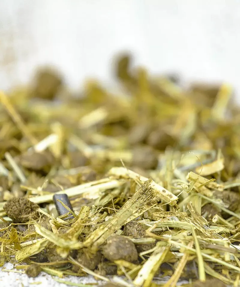 Ez egy vegyes szerkezetű keverék, amelyben hosszú rostszálak, pelyhek és pelletált alkotóelemek egyaránt megtalálhatóak.