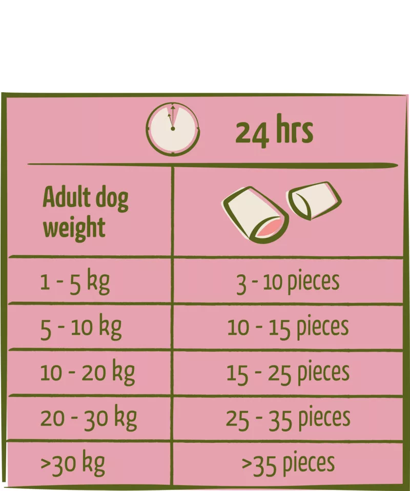A kisméretű falatkák bármilyen testméretű kutya számára megfelelőek, és szükség esetén könnyen tovább felezhetőek.