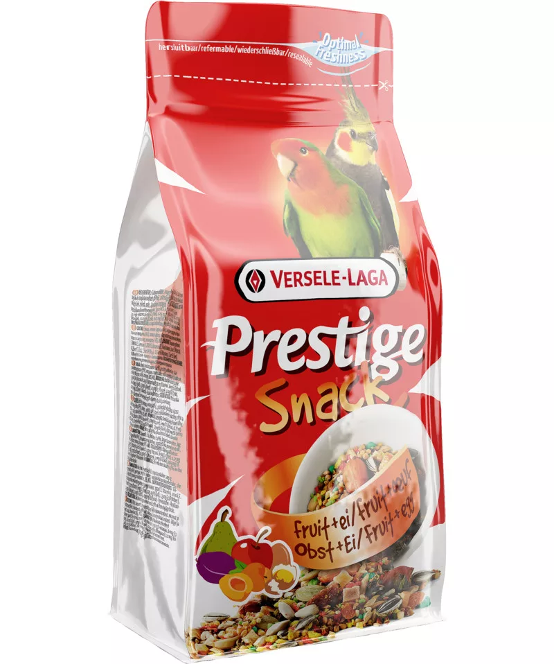 Minden madárgazda tudja, hogy a tollas barátok élete nem csak a főeleségről szól. A változatosság nemcsak az étvágyat tartja fenn, hanem a madarak mentális egészségéhez is hozzájárul. A Versele-Laga Prestige Snack Big Parakeets egy olyan prémium kiegészítő keverék, amely ízletes gyümölcsökkel és tojással teszi izgalmasabbá kedvenced mindennapjait, miközben fontos tápanyagokkal látja el szervezetét.